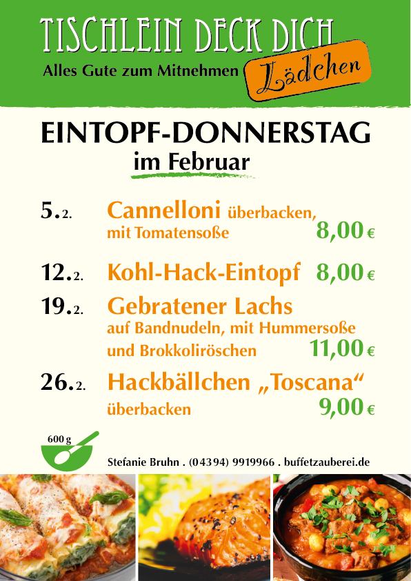 Haben Sie vielleicht auch mal keine Zeit oder keine Lust zu kochen? Einmal in der Woche halten wir ein schnelles Mittagsessen für Sie bereit!